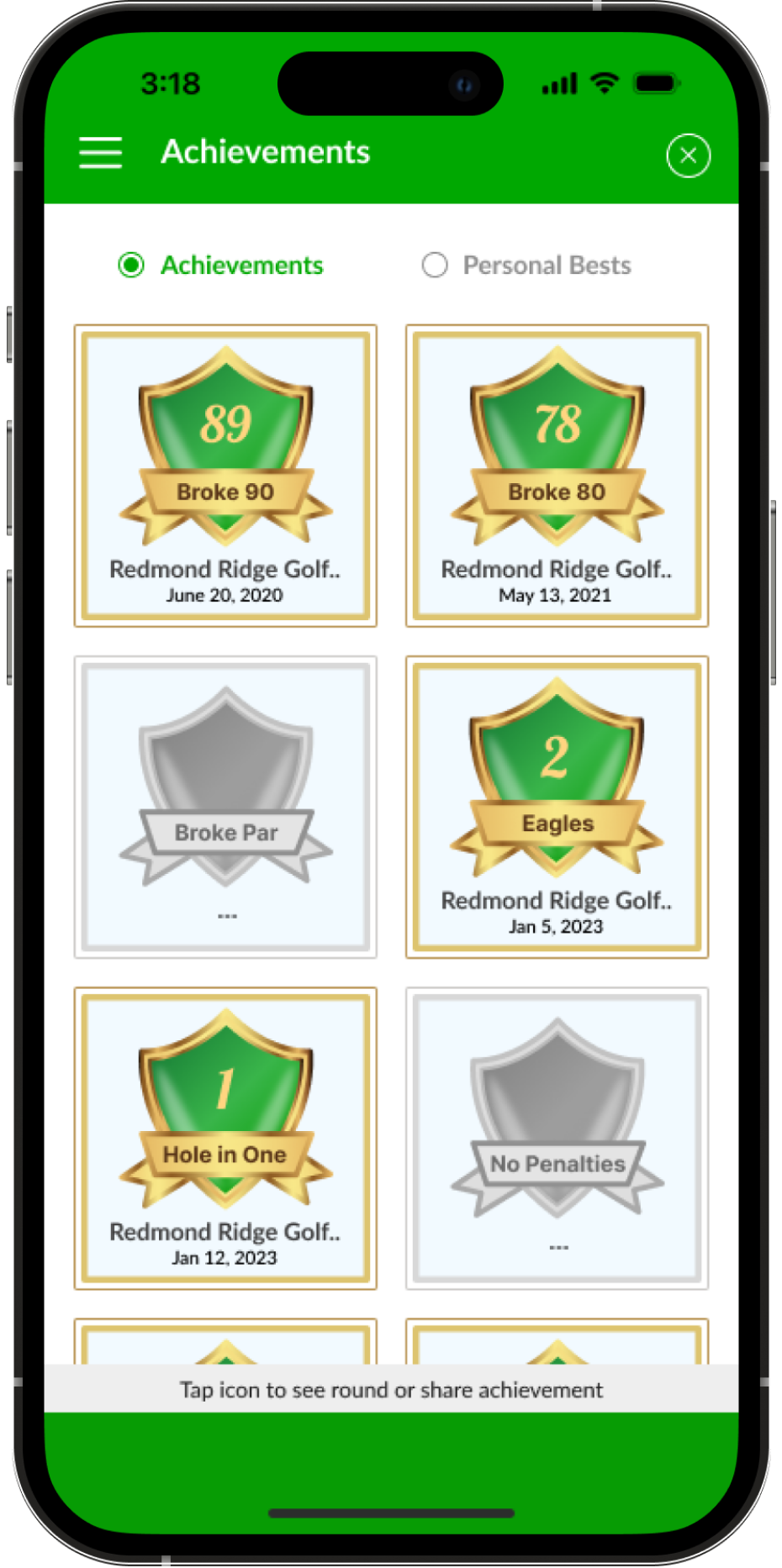 We automatically track a hole in one or when you brake 90, 80 or par. The achievement wall also recognizes rounds with no penalties, or no <br> doubles, or number of eagles to keep you motivated.