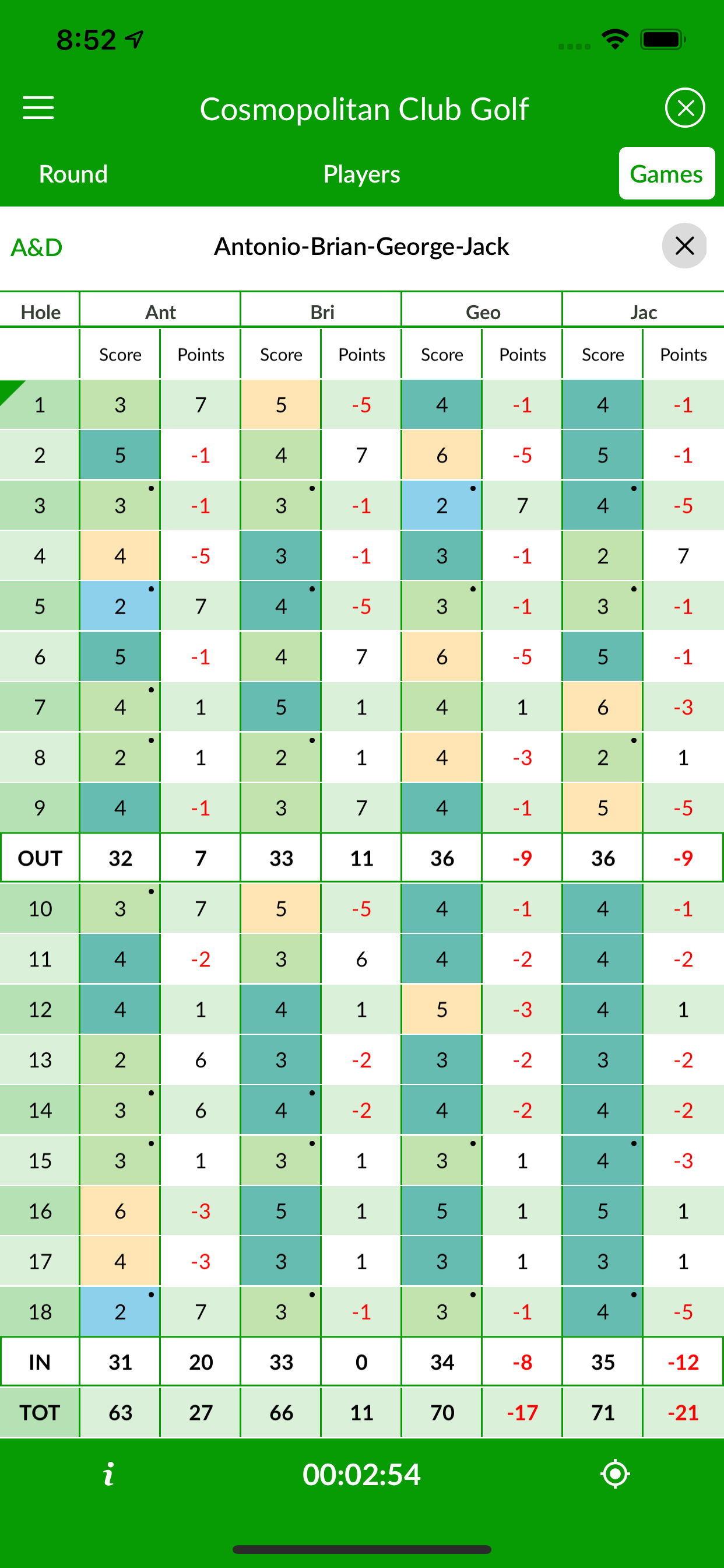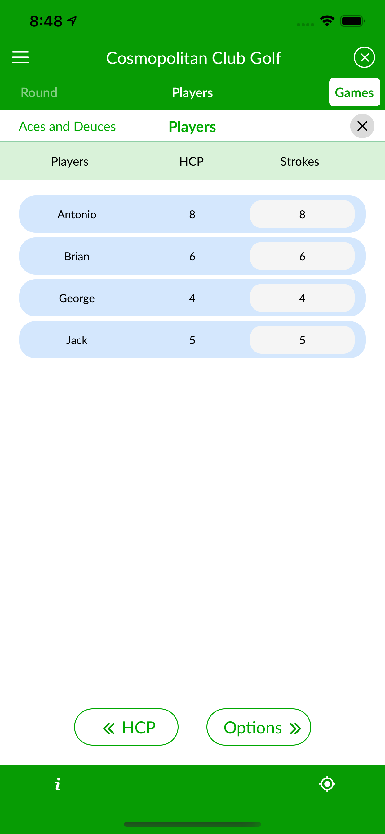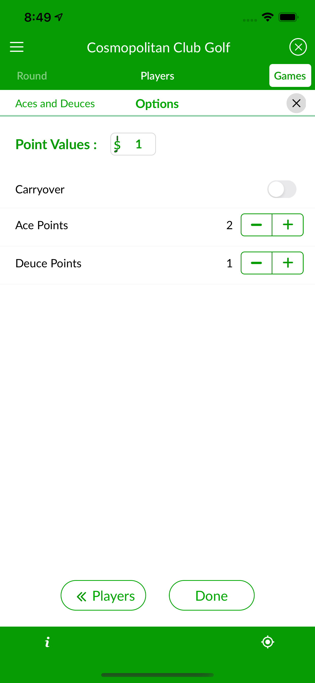 The Aces and Deuces betting golf game is a points style game where golfers wage on a per hole score. There are two bets per hole, one for the low net score, the Ace, and one for the high net score, the Deuce. All players pay the hole bet to the Ace, while the Deuce pays out the Deuce bet to each player. If there is no Ace or no Deuce, there is no payout for that bet for the hole. If playing with carryover, the bet amount is added to the next hole. In a typical bet, an Ace is worth twice the value of the Deuce, but BEEZER GOLF lets you configure it. In the scorecard, bet amounts are represented by points.