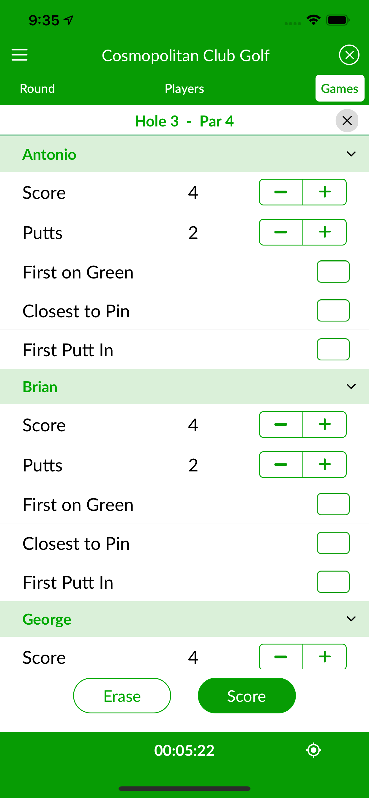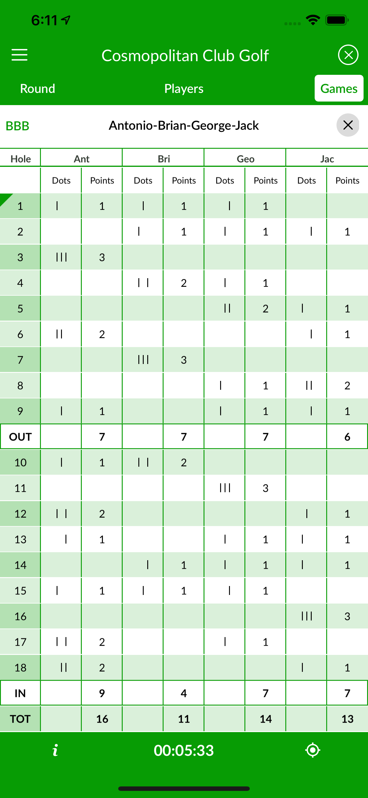 This popular dots game is fun and easy to play. A Bingo point is awarded to the first player to reach the green and a Bango point to the player closest to the hole — and once all players are on the green. And, a Bongo point is awarded to the first player to hole the ball. It’s a good game for high handicap players, since low handicappers should be able to reach the green in regulation, making the purpose of the game somewhat moot. The player with the most points wins the match and pockets the pot.