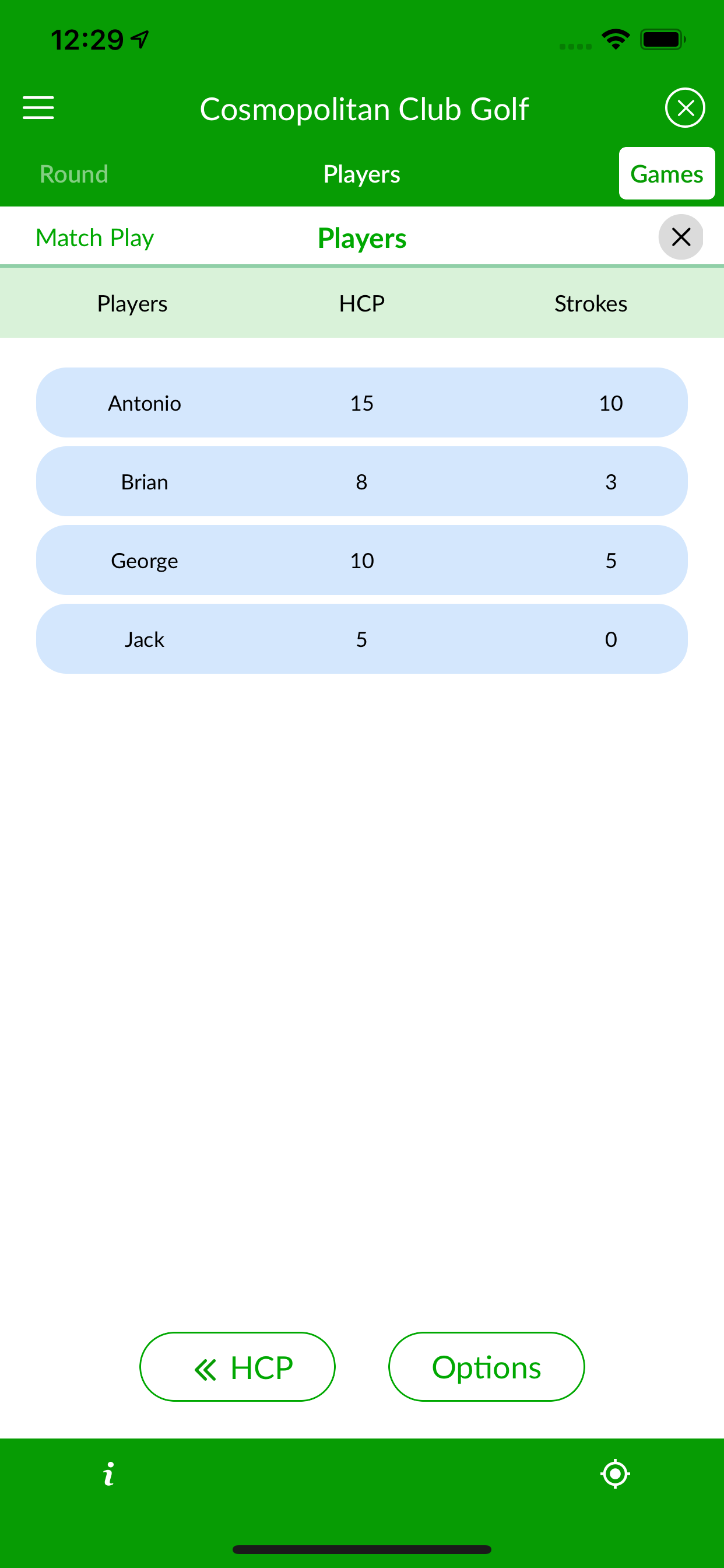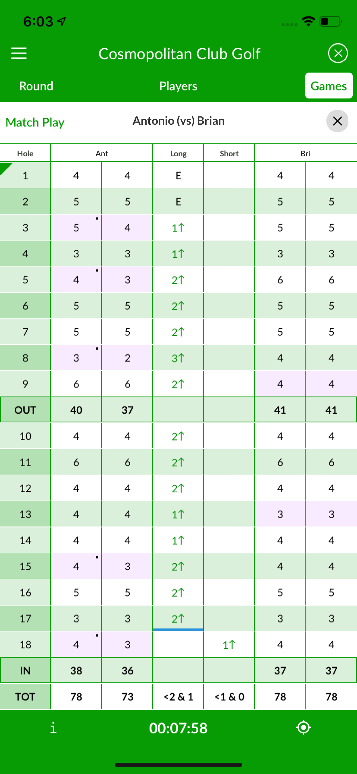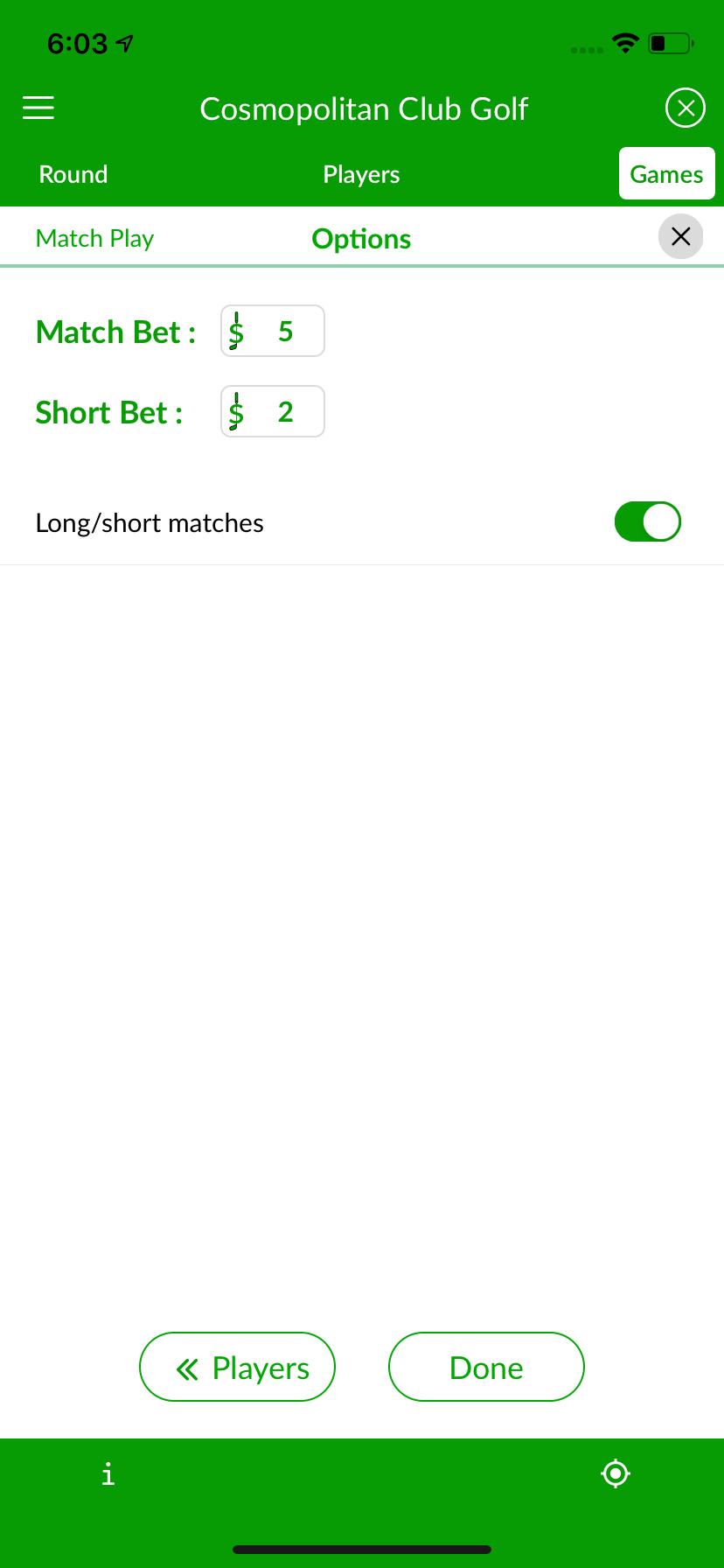 Match Play is a classic game for two players. A player wins the hole by obtaining the lowest net score. A fun option to the game is playing a short match if and when the original match is over and for the remainder of the holes. Usually, the bet of the short match is half that of the first bet. The game is suited for all handicap levels, but it is best for players with the same skill level. The winning player wins the match bet.