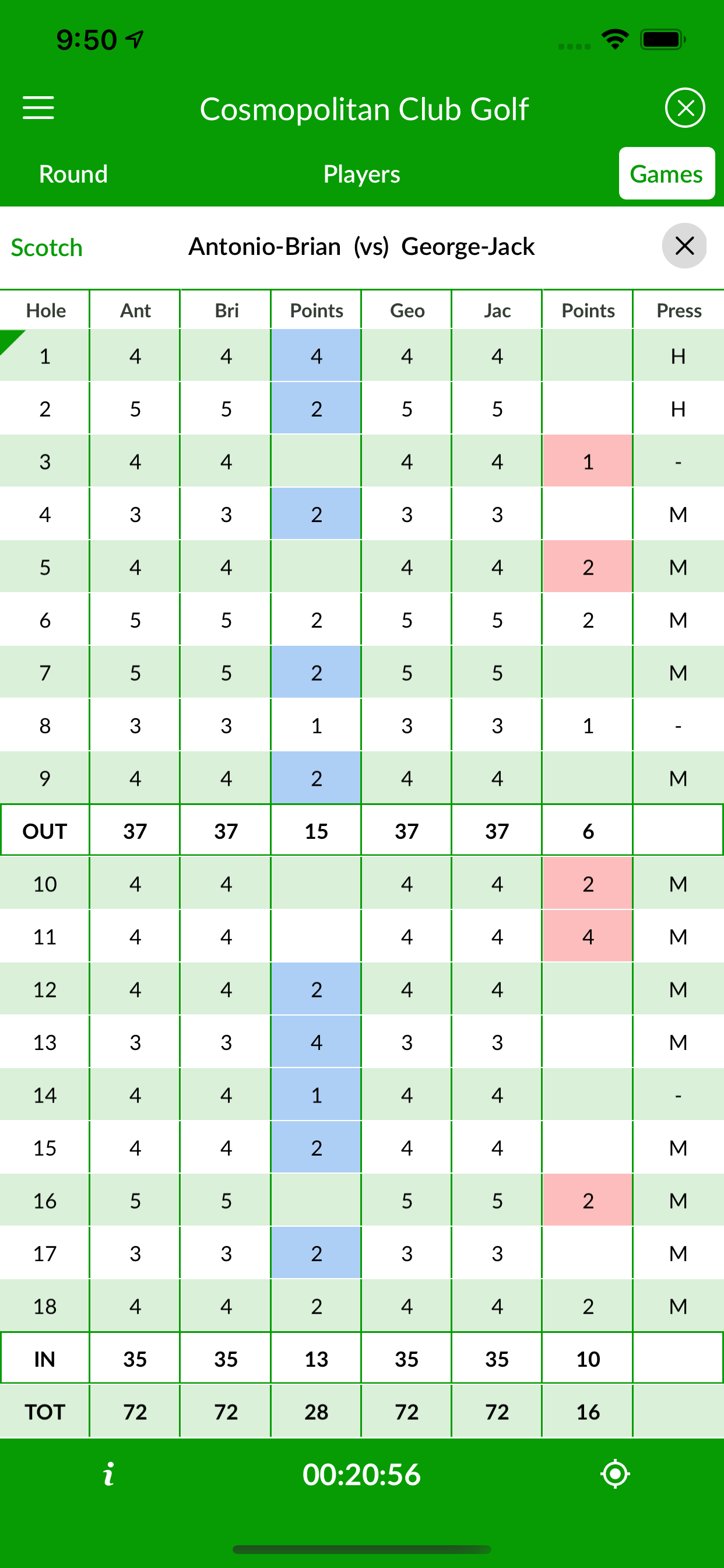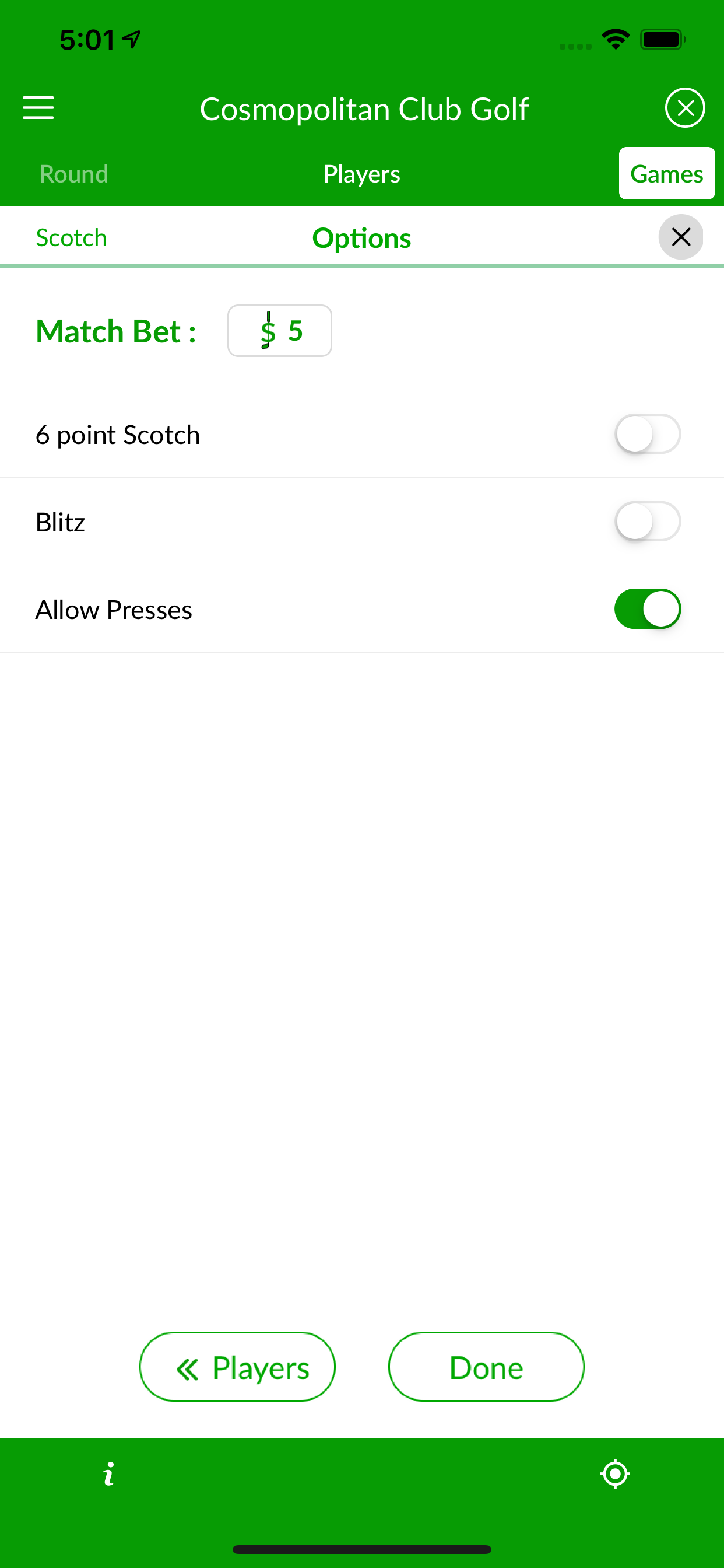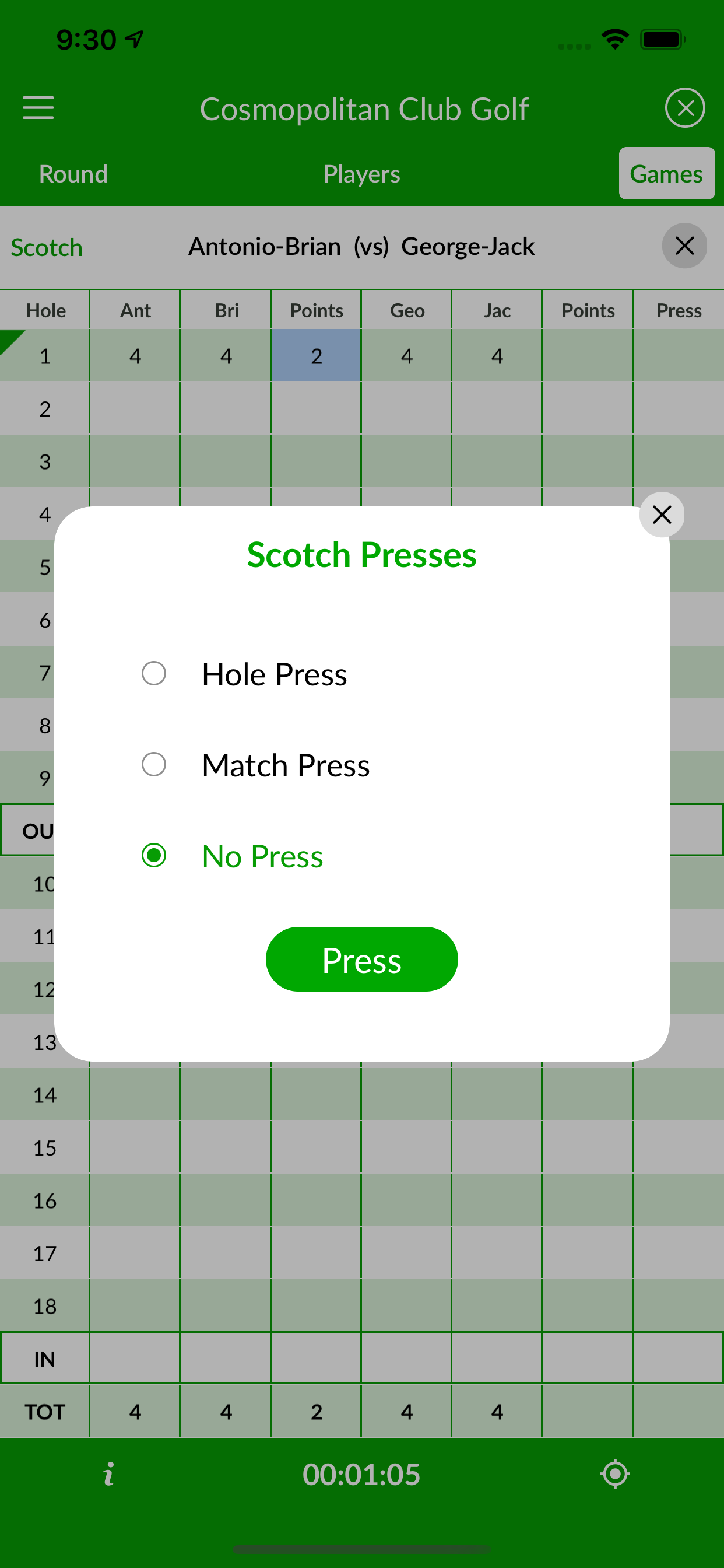An old-time favorite, 5-point Scotch, and its variation the 6-point Scotch, is a team points game that awards points for hitting dots. The team with the highest points wins the game and the match bet. A press in Scotch is different from a Nassau press. In Scotch, a player can press a hole doubling the bet (number of points awarded) in the hole. There is also the option to press the match, effectively doubling all hole points for the rest of the match.