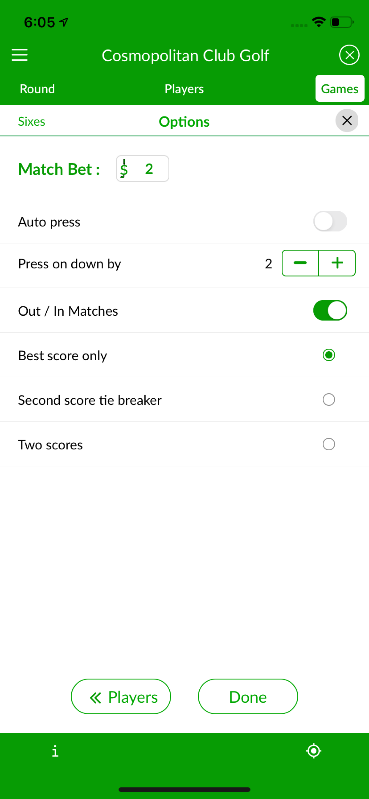 The losing team can press a match, and if a press is accepted, a new match starts from the next playing hole until the end of the original match pressed. That way, if the total (TOT) match is pressed on hole 3, a new match is created between hole 3 and 6. A press match can be pressed many times, and each time a new match is created for the remaining holes of the original match. For example, if a press match between holes 3–6 is pressed on hole 5, another match is created between hole 5 and 6.