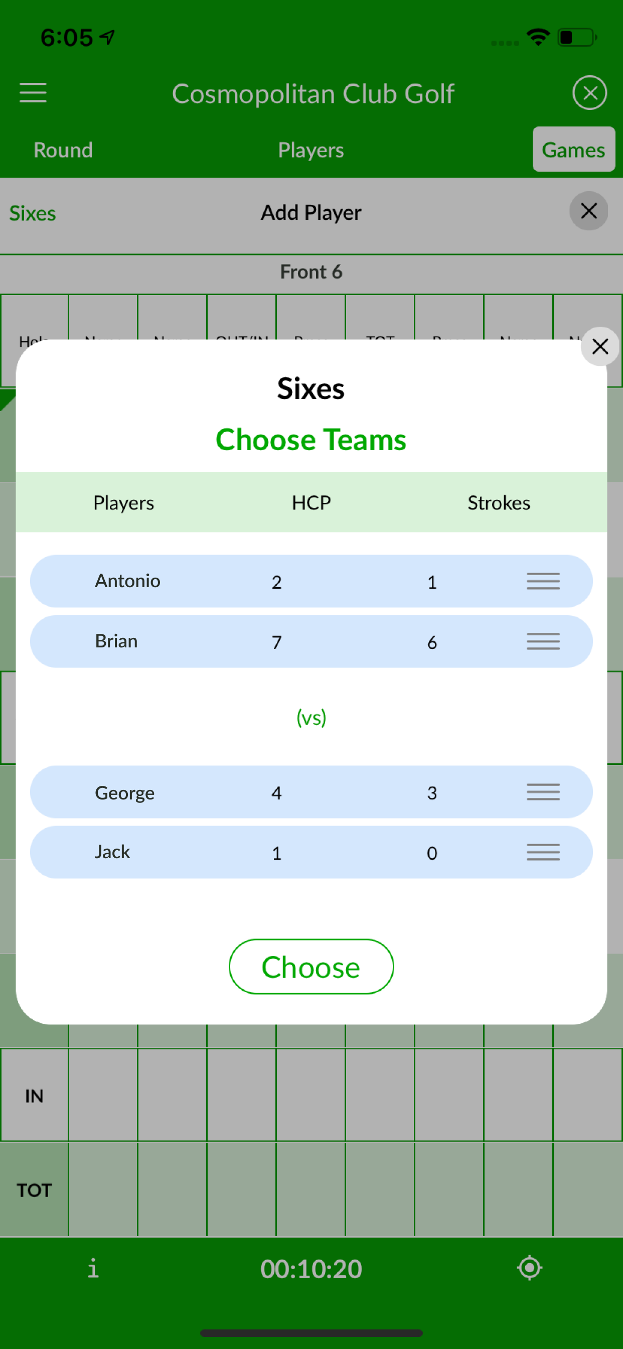 Sixes is a team match-play game where the teams change every six holes. You can play Four ball style Sixes, or Nassau-style Sixes. In the Nassau version, the IN match is the first three holes and the OUT the last three, while the total is the combined six holes. The teams for each course third (referred to as Front 6, Middle 6, and Back 6) are picked by the players before hole 1 and 7, respectively, and automatically set for holes 13–18.