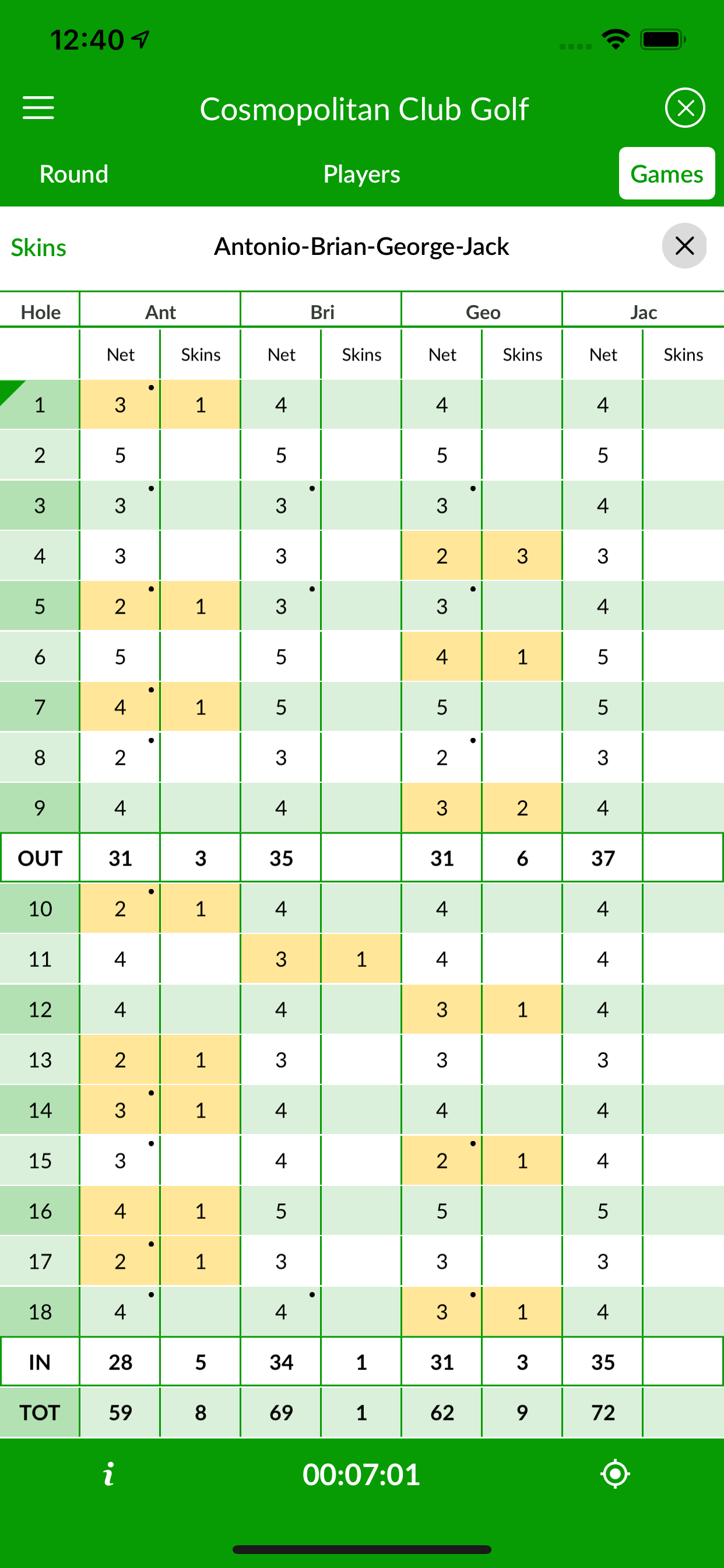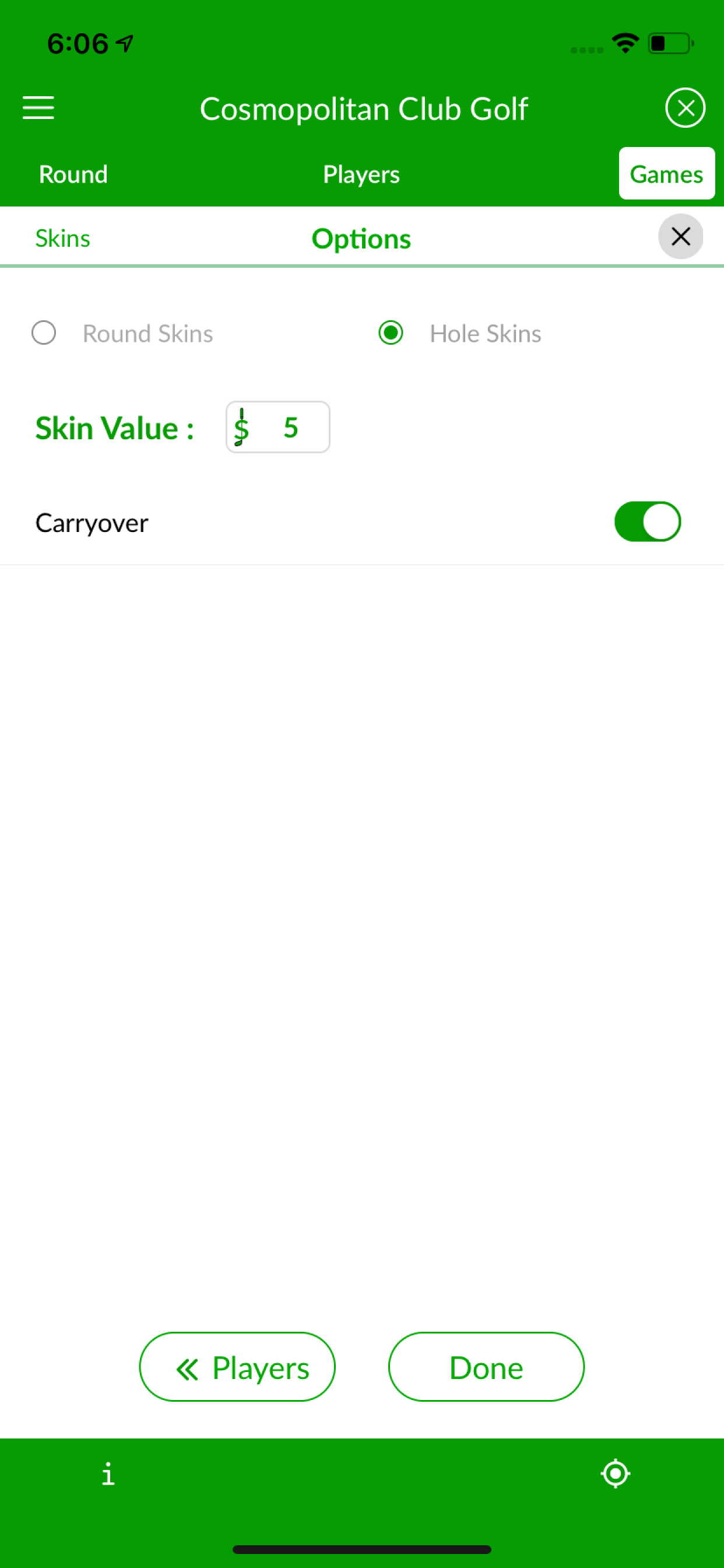 In the Skin Value option, the skin value is preset to the skin value amount. On each hole with a skin, the low score wins the skin value bet from each of the other players.