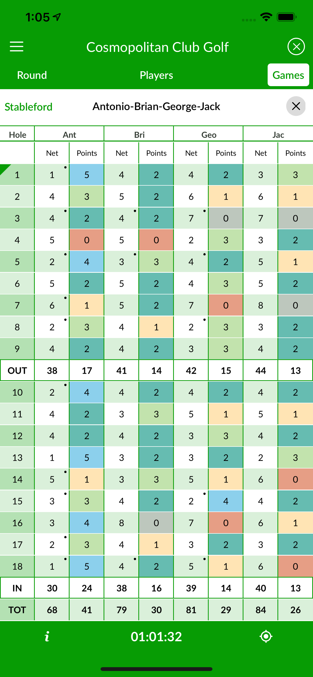 The classic Stableford is a points-scoring game aimed at reducing the impact of high-score holes. Players are awarded points based on pars, bogyes, etc., and the player with the highest points wins the match bet from other players