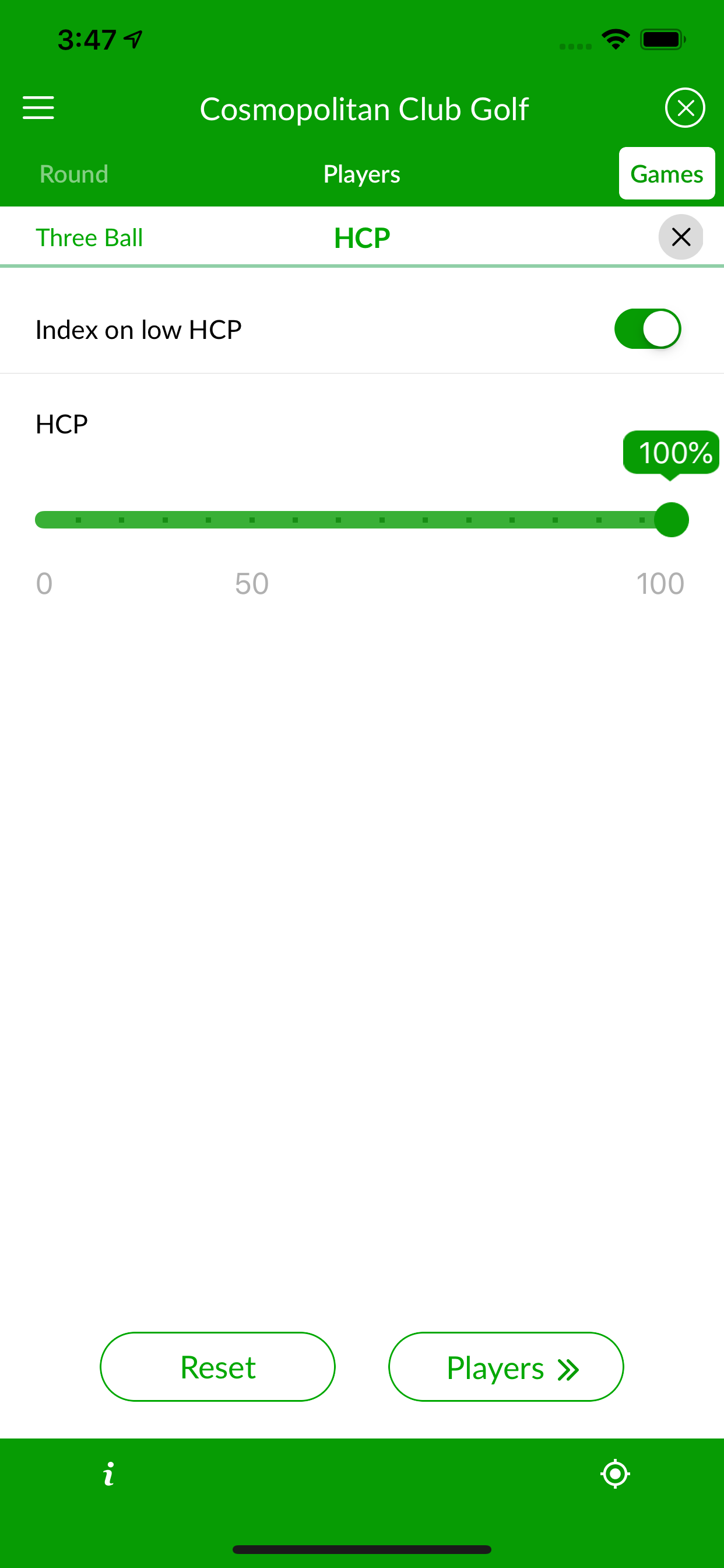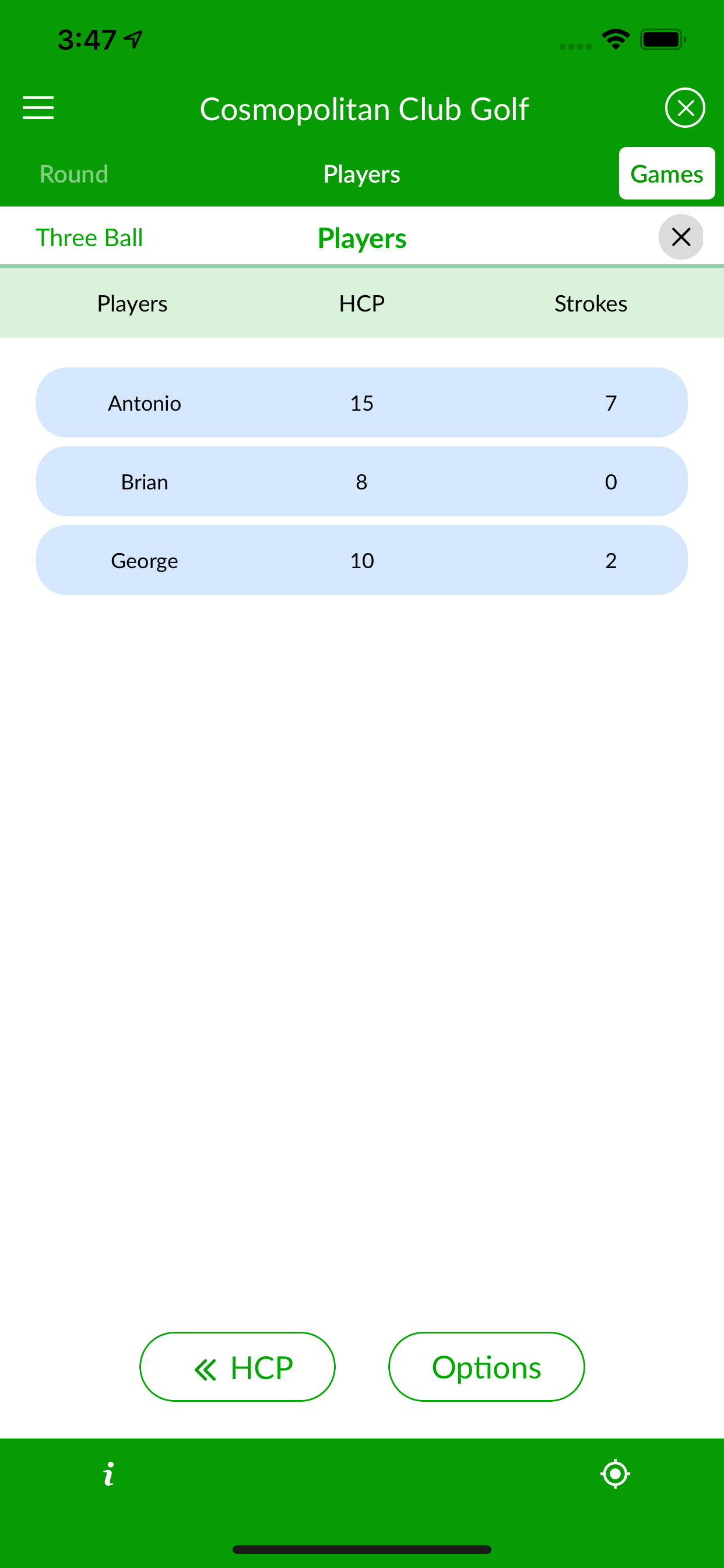 With the Teams options, in every hole, there is a three-way team match where each player belongs to two teams. The members of the team with the lowest aggregate score each get a point and the player with the most points at the end of the round wins the match bet. There are three teams competing—the first team with Players A and B, the second team with Players A and C and the third team with Players B and C. The team with the lowest net aggregate score wins the hole and each member gets one point. No points are awarded for ties. For example, if Team 1 is Player A and B, Team 2 is Player A and C, and Team 3 is Player B and C, then, if Player A’s net score is 3, Player B’s net score is 4, and Player C’s net score is 5: The Team 1 score will be 7, the score for Team 2 will be 8, and Team 3 score will be 9. Team 1 wins the hole, so Player A and Player B get one point each.