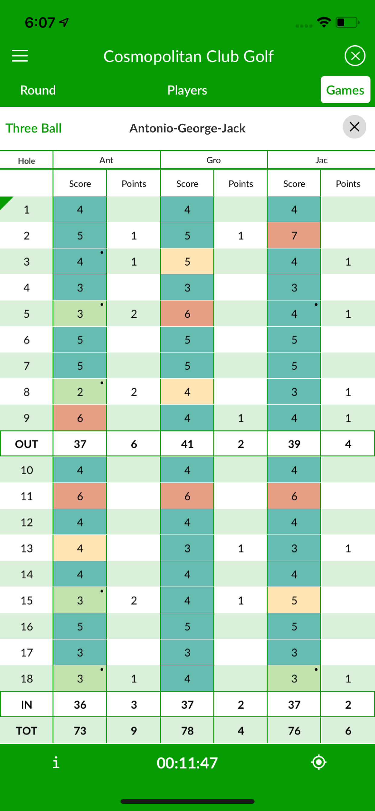 Three Ball is a match play that is a great game for threesomes. Each player plays as an individual against the other two players, and the low net wins the hole; hence, a player can win up to two points per hole. Golfer A plays one match against B and another against C. Golfer B plays one match against C and another against A. Golfer C plays one match against A and another against B. Each won hole gives one point, so if player A has a net 3 and B has a 4 and C has a 4, player A gets 2 points, one for winning against B and one for winning against C.