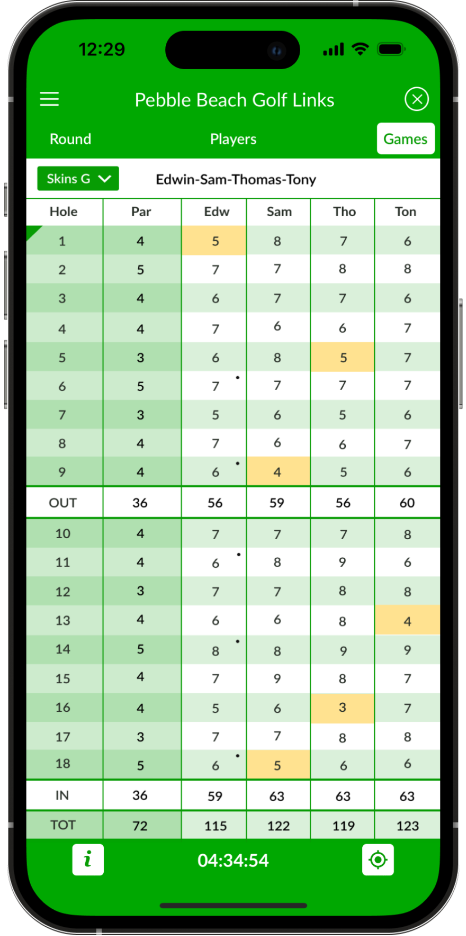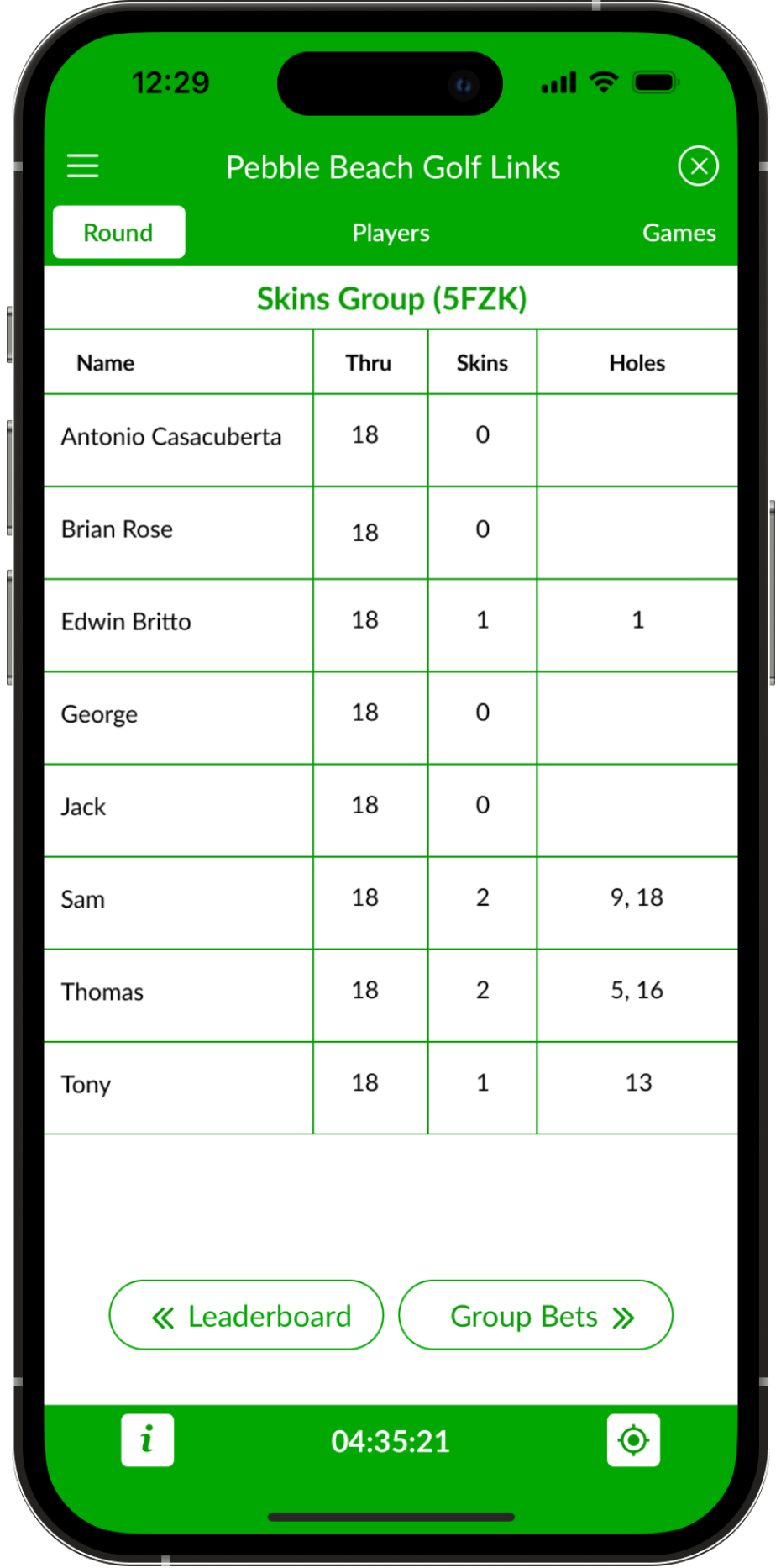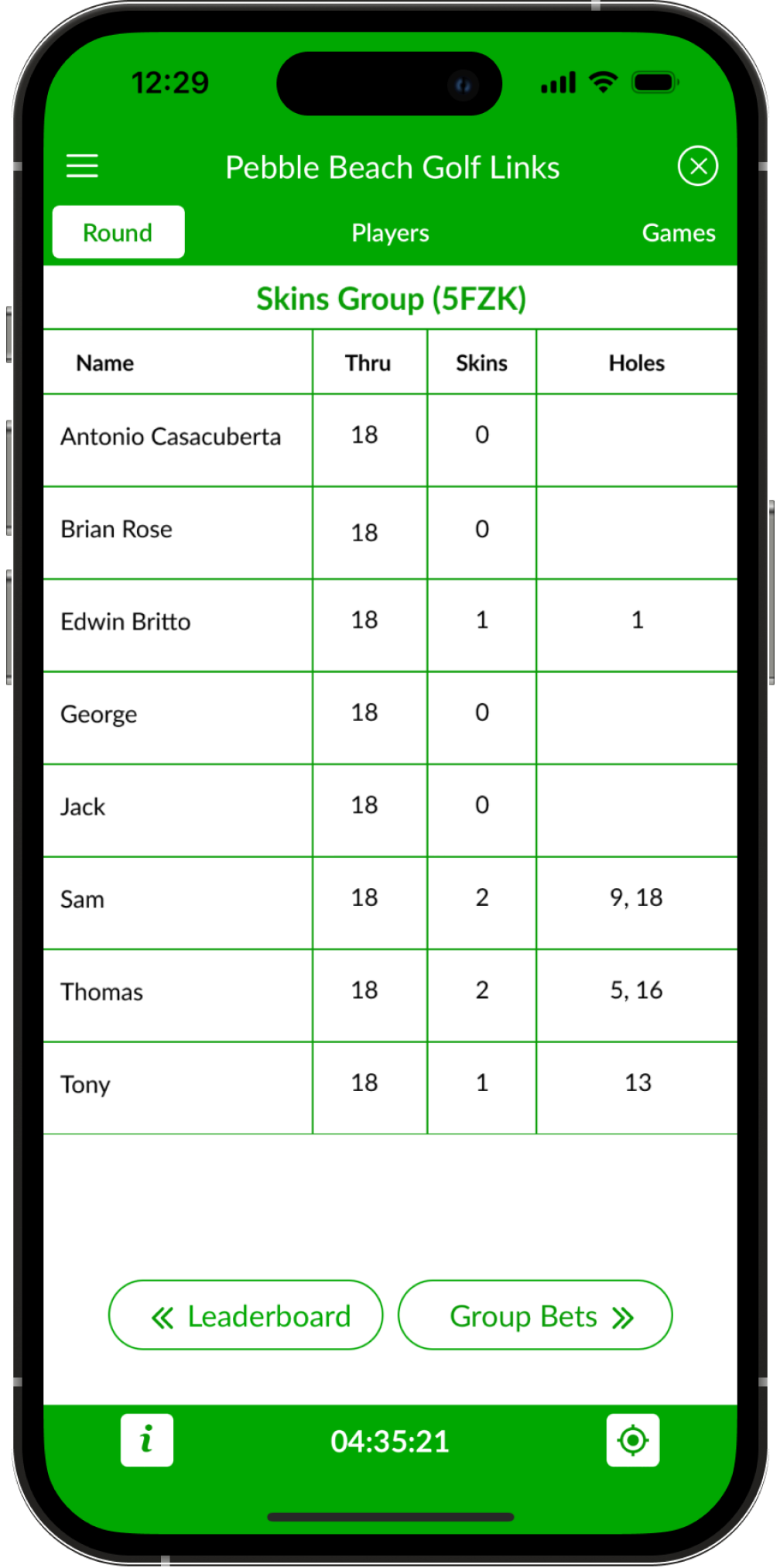 The leaderboard provides an up-to-minute scores as well as other scoring data, like in what holes the Skins are being won. Know, instantly if you have the Skin … so far.