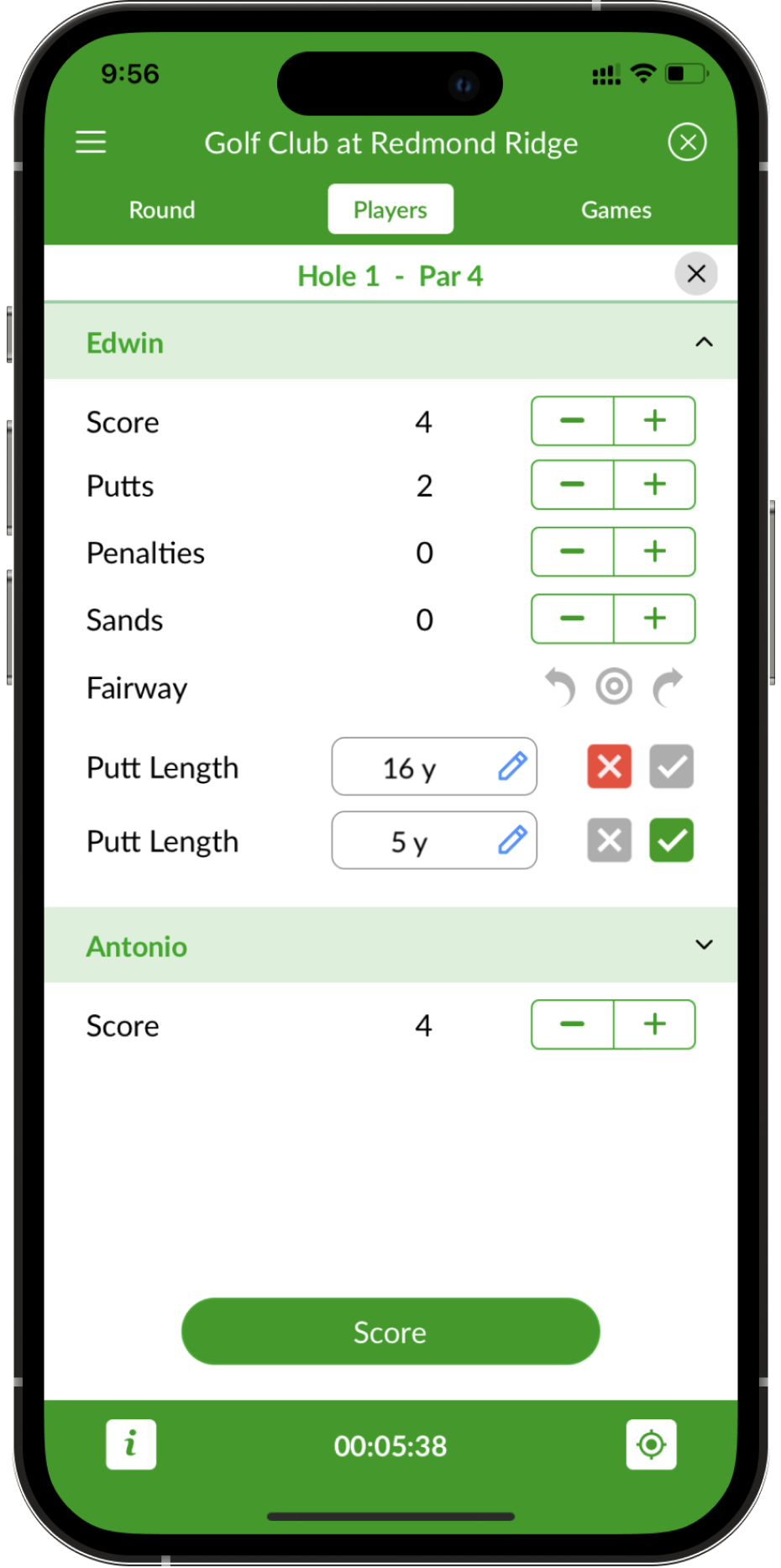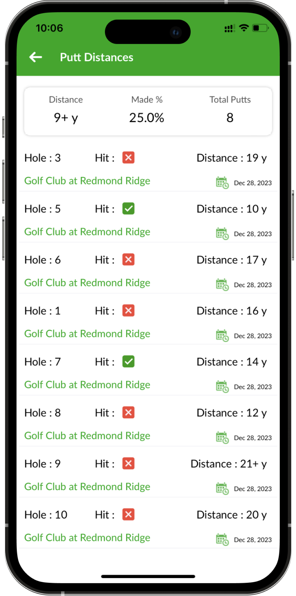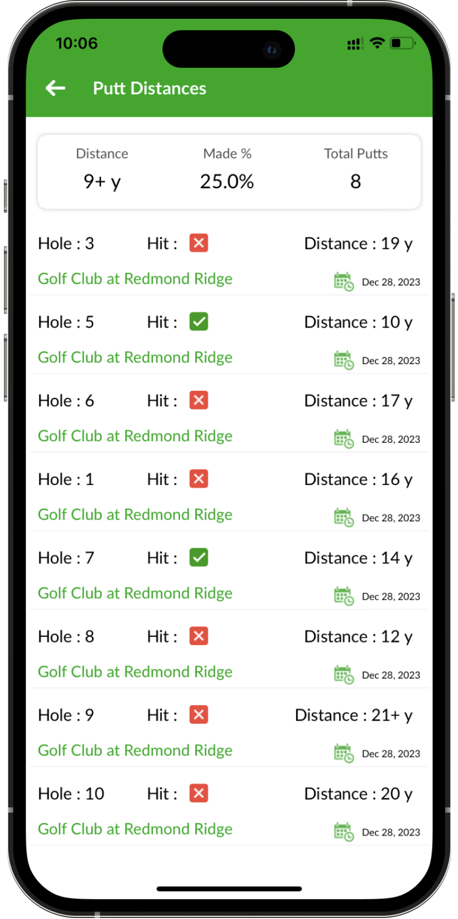 Entering your putt distances and whether you made or miss the putt will let you track you putt distances percentages and your proximity to the hole.
