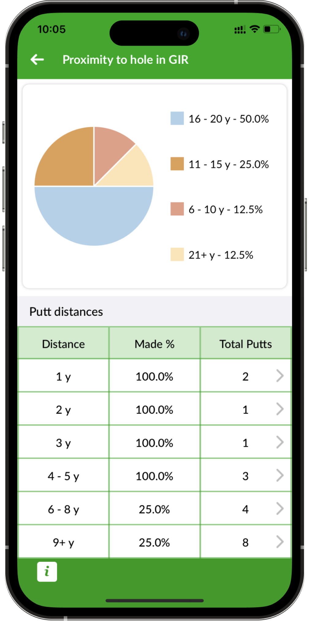 Understand your game better by knowing how close you hit your approaches to the flag, and what putt distances are more challenging.